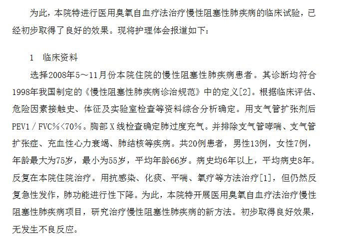 A、血液回输,脂质氧化物可以作用内皮细胞表面,提高前列腺环素和NO的释放,而内皮缩血管肽I的释放被抑制。NO和亚硝基硫醇的释放促进血管舒张,而阴离子超氧化物的释放会造成血管紧缩,并且对血小板和内皮细胞产生负面影响;B、缺血组织氧输送的增强、抗氧化酶的加强、血红素加氧酶I中和慢性氧化应激。C、对于免疫系统刺激可以控制慢性肺部感染。通过臭氧治疗COPD可以打到良好的效果,包括改善呼吸系数和步行试验。
