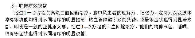 抽取 100-150ml 静脉血注入到专门的带有抗凝剂的血袋里,然后向血袋输入已准备好的三氧混合气(三氧浓度 20-40μg/ml ,约 100-150ml)臭氧和血液容量是1:1,比如抽出100ml血液,那么就需要打入100ml臭氧混合气。慢慢晃动血液,轻轻混合血袋里的内容物 5 分钟,然后把血液重新回输到患者静脉中(在25分钟内完成)。一般情况下,一个疗程为 8-10 次。