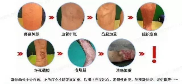 答: 一种并发症是皮肤出现皮炎,往往表现为湿疹,病人感觉很痒,主要发生在小腿。另一种比较危险的就是曲张静脉内形成血栓,其症状除了感到疼痛,一旦蔓延进入深静脉,可能导致肺栓塞,有致命风险。还有一种比较危急的并发症是曲张静脉破裂出血,因为压力高、出血量大,而且往往不伴疼痛,患者无法及时知晓,可能发生出血性休克。