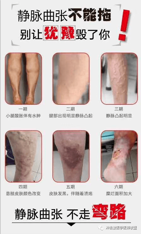 第六期:未经正确治疗的静脉性溃疡反复发作,常见于踝关节附近及小腿下段,俗称“老烂腿”。