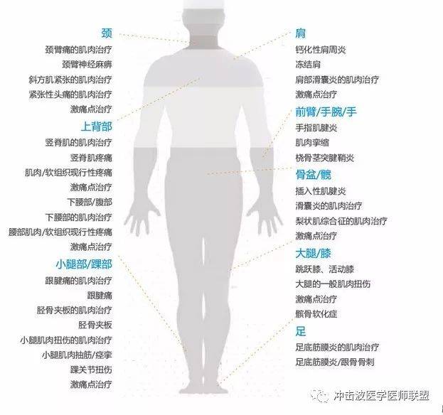 1、软组织慢性损伤疾病,冈上肌腱炎、肱骨外上髁炎、足底筋膜炎、跟腱炎等。
