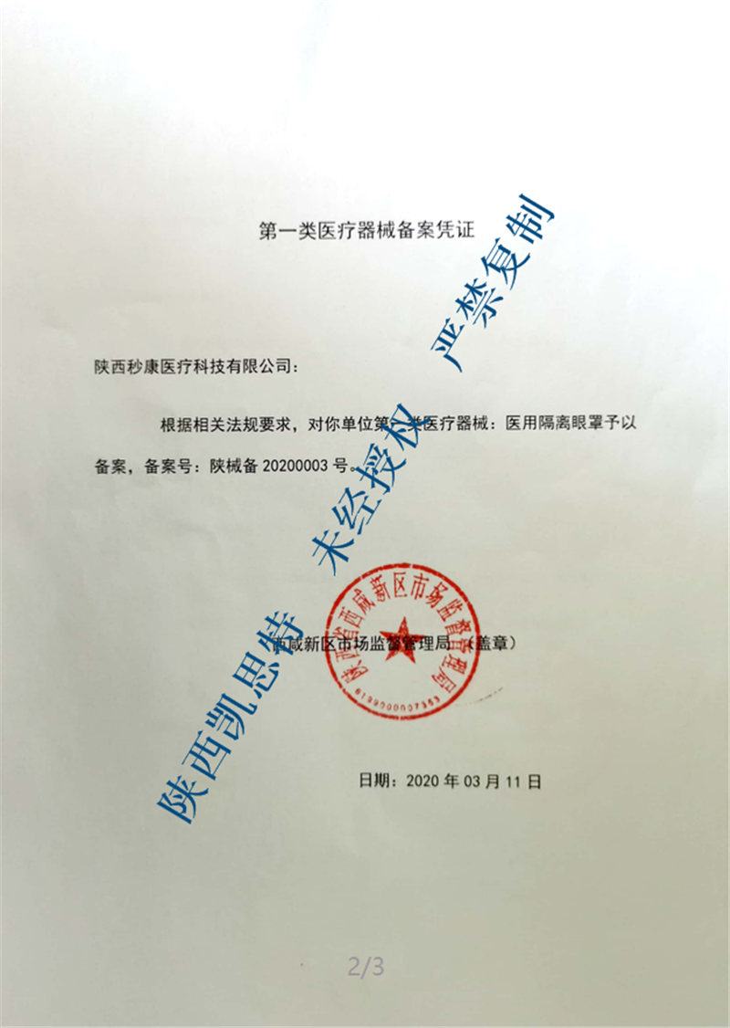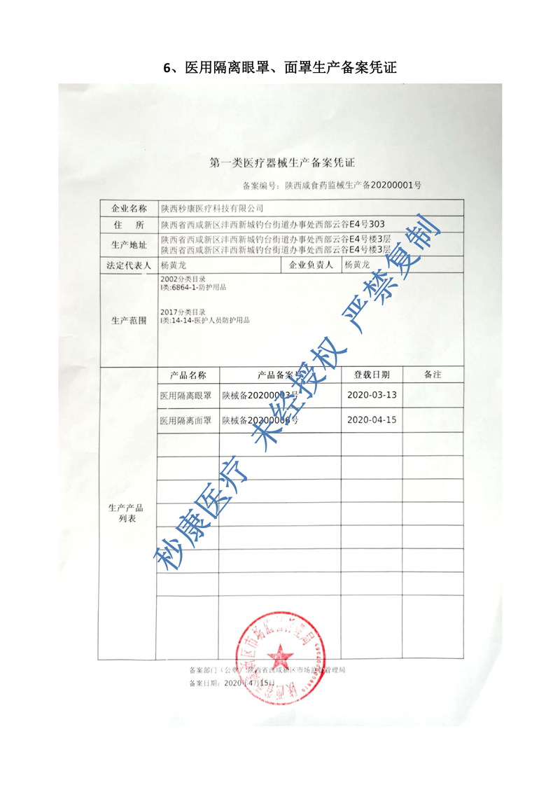 医疗器械生产备案凭证编号:陕西咸食药监械生产备20200001号