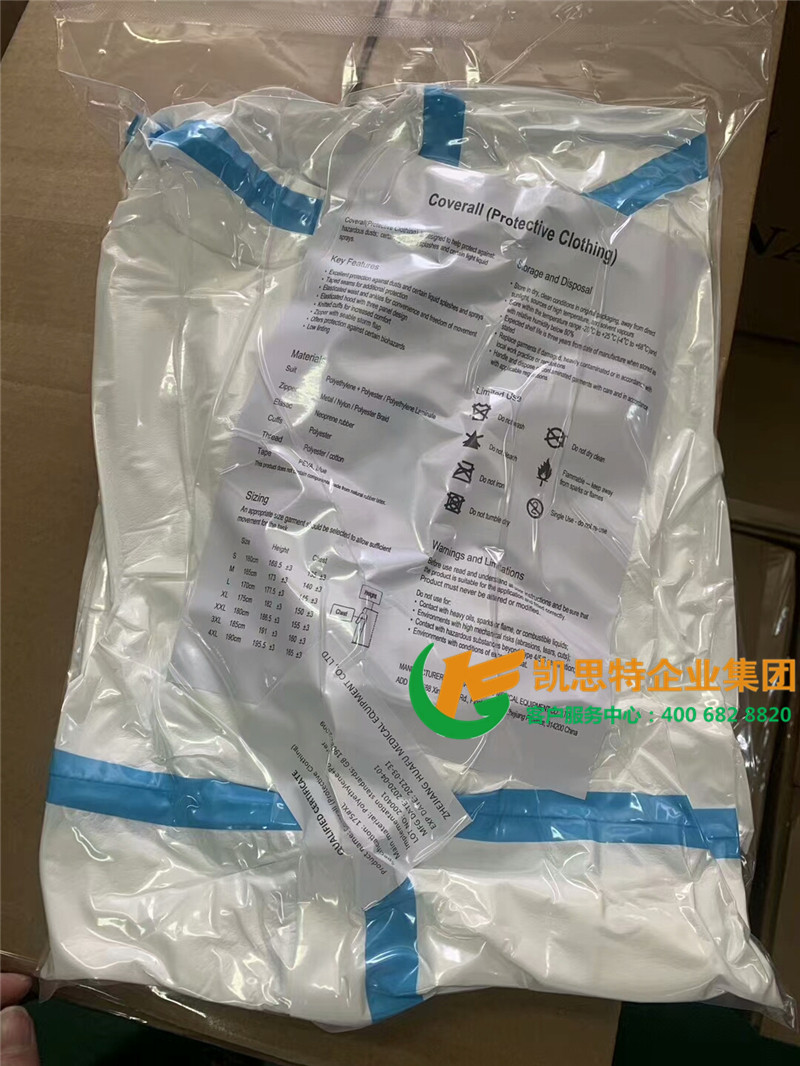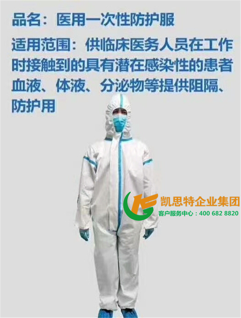 【产品材料】医用透气复合膜为主要原材料,为高级医用防护材料,经裁剪缝纫制成加厚型衣帽一体连体服,手腕处,脚踝处均有弹性收口,材质轻盈、透气。